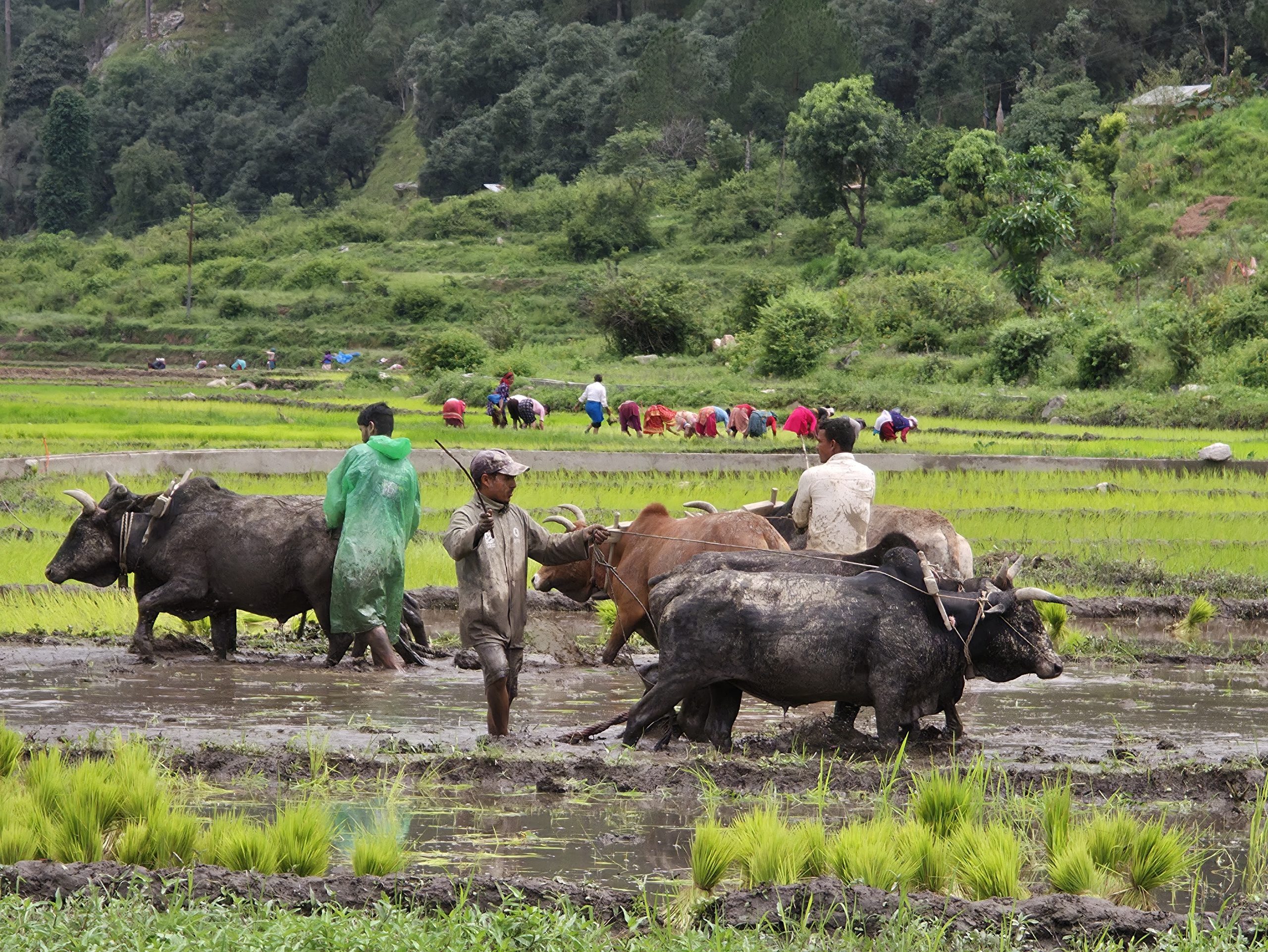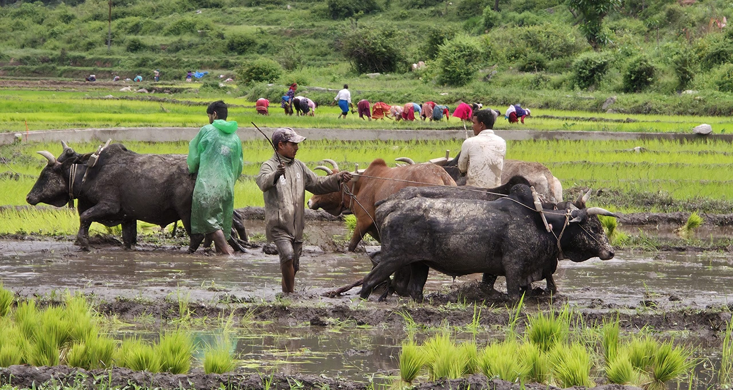 Photo 2: Farmers engaged in ploughing and puddling the field in preparation for planting Jorayal Basmati rice